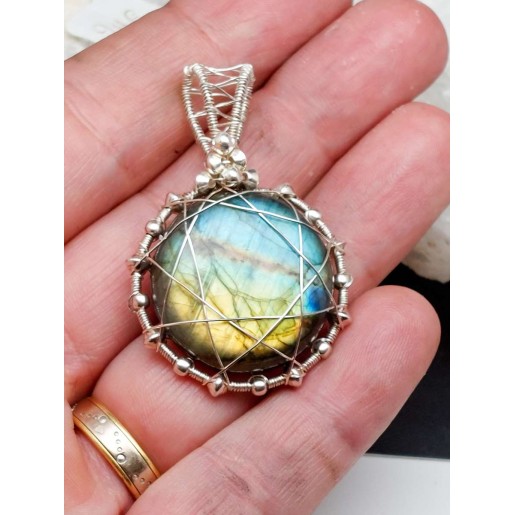 Magnifique cabochon de Labradorite à reflets bleus, verts, dorés monté en pendentif 💙
