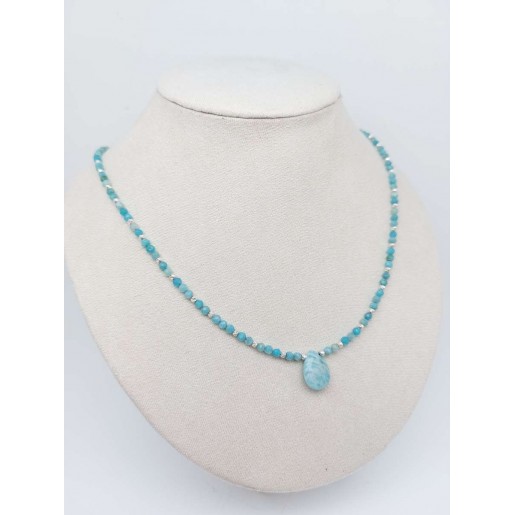 Ce collier a été réalisé avec de petites perles à facettes 3mm et une belle goutte 12x10mm en amazonite naturelle, non teinté.